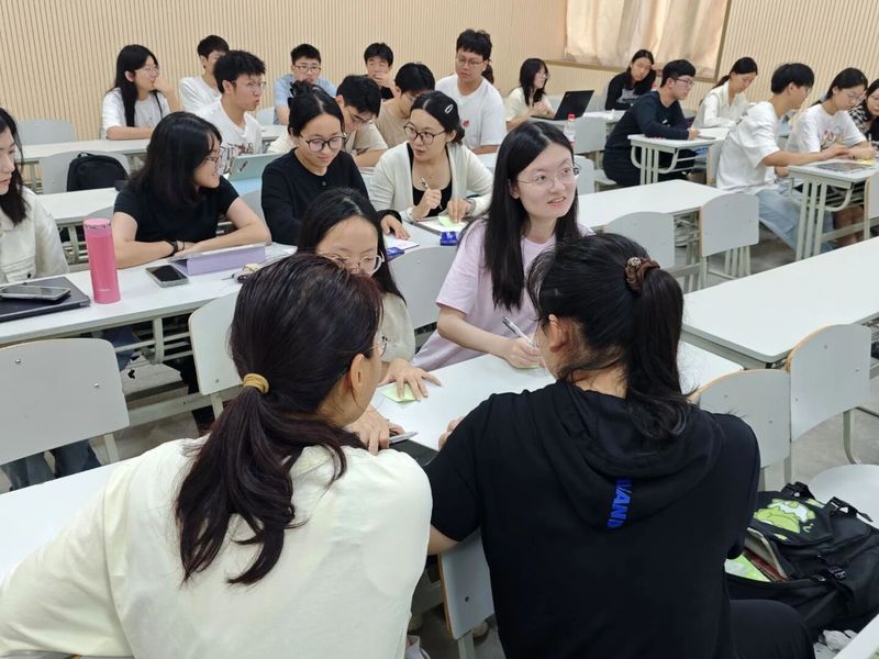 公开课伊始,刘锦老师以盛大的九三阅兵为引,请同学们进行了一场结构化研讨体验,让同学们从“听众”变“主角”。体验活动分多个环节层层递进。有的小组聚焦阅兵式上的先进国防武器,从装备技术的迭代中追溯我国国防从“站起来”到“强起来”的奋斗路;有的小组结合国际关系格局,探讨强大国防对维护国家主权、守护世界和平的重要意义。最后,各小组通过绘制鱼骨图的形式,将零散思考转化为系统观点,在课堂上清晰展示共创成果,现场掌声与讨论声交织不断。