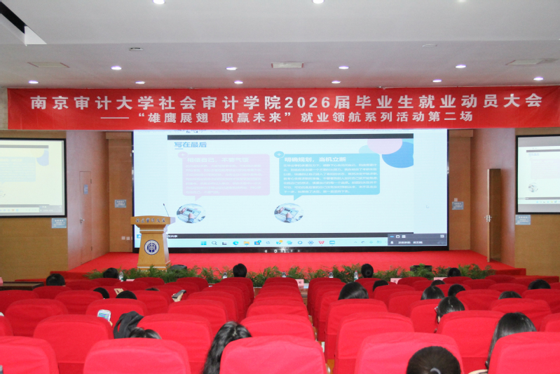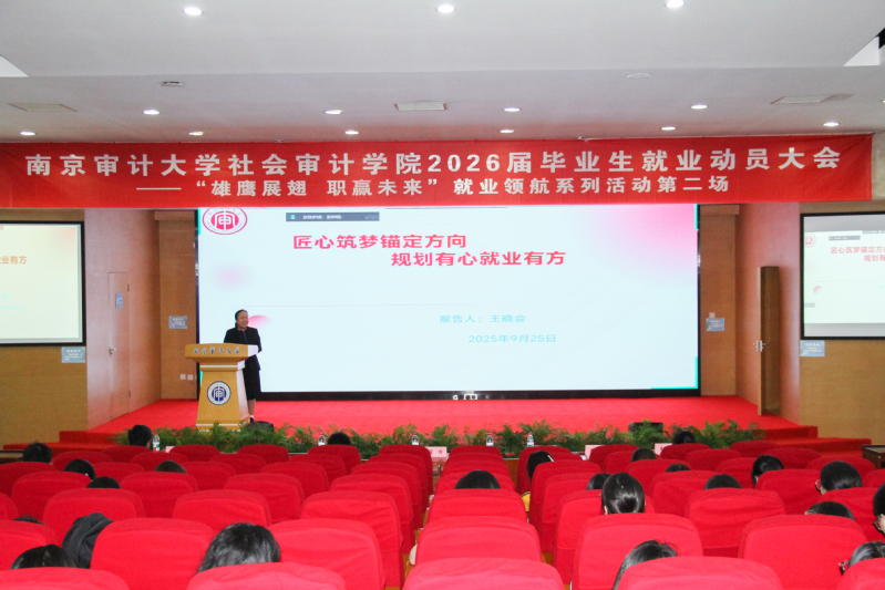 当毕业季的钟声悄然临近,2026 届社审学子站在了人生选择的关键路口。为帮助大家明晰方向、从容前行,9 月25日14:30,南京审计大学社会审计学院在敏达学术报告厅举办了 “雄鹰展翅职赢未来” 就业领航系列活动第二场:2026届毕业生就业动员大会。招生就业处、研究生院和学院诸位领导及老师与优秀校友代表们齐聚一堂,围绕考研、考公、就业三大核心方向,通过政策解读、经验分享、数据支撑,为学子们搭建起通往未来的 “导航图”。