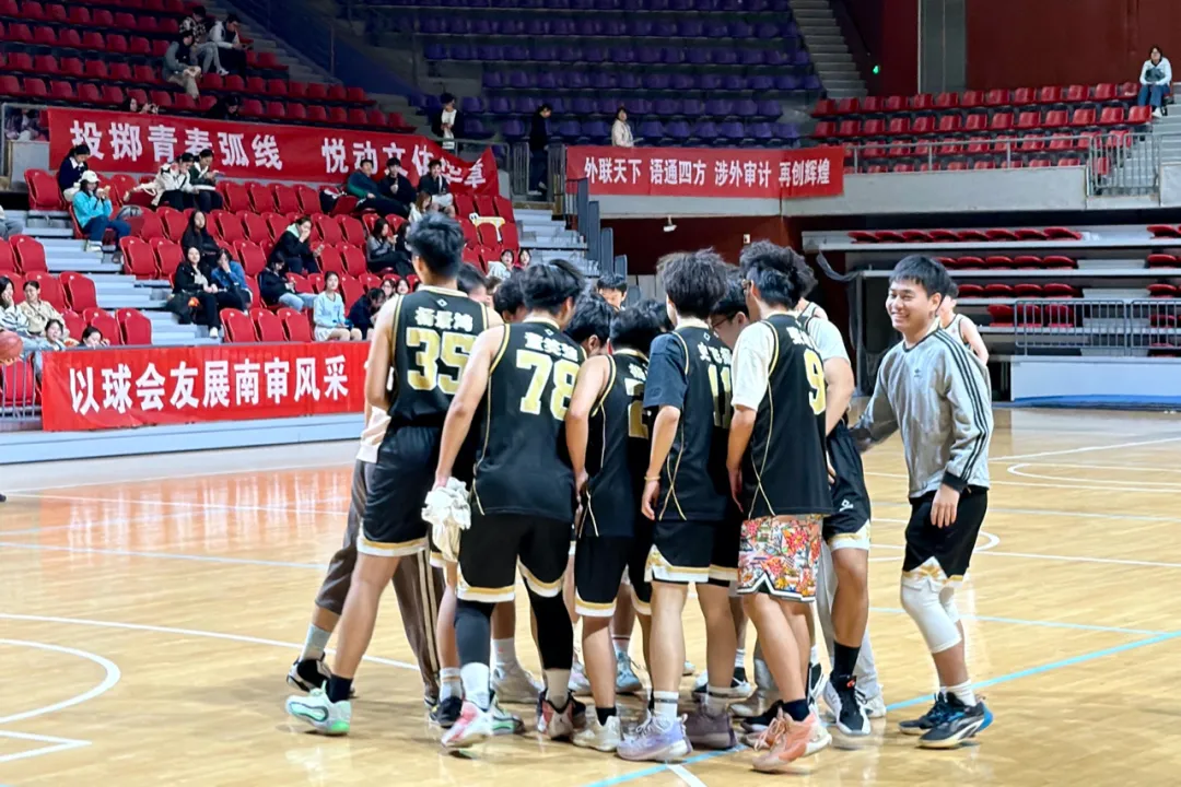 当篮球撞击地板的声响在球馆回荡,当球衣上的队名在灯光下熠熠生辉,社会审计学院的男篮队员们正以最坚毅的姿态,在赛前围成紧密的战团,面对着实力强劲,曾经取得不俗战绩的经济学院篮球队,他们毫无畏惧——这是属于他们的“热血结界”:彼此的击掌带着滚烫的决心,眼神的交汇传递着拼搏的信念。