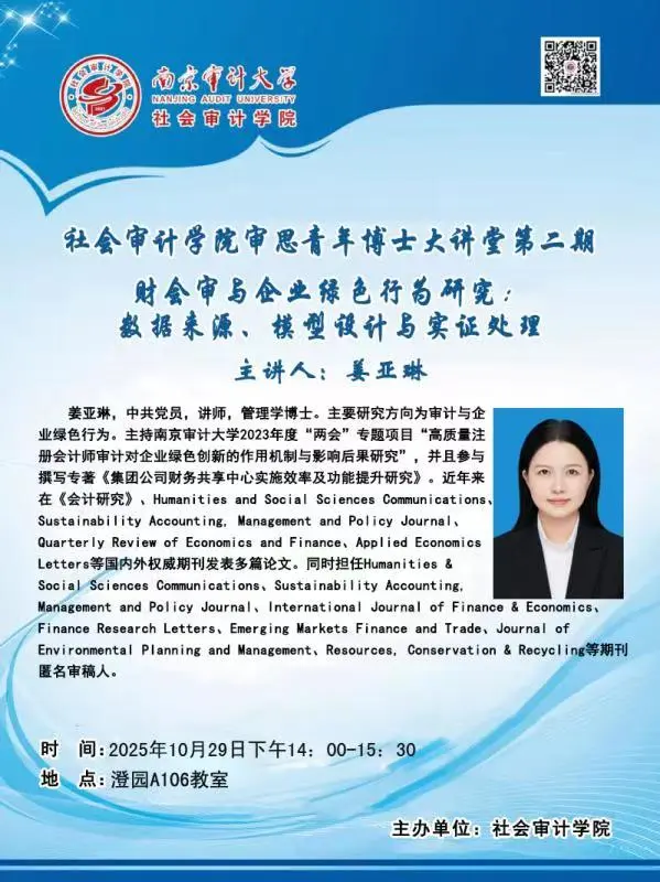 讲座预告:社会审计学院审思青年博士大讲堂第2期财会审与企业绿色行为研究:数据来源、模型设计与实证处理