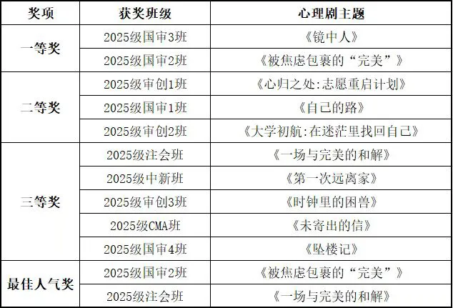 经过评委团评审与现场观众投票,本次心理剧初赛各班级获奖如下: