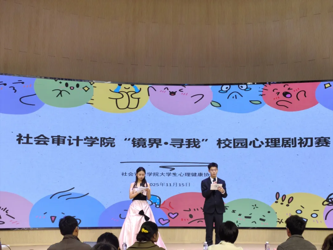 数字潮涌映照百态人生,心剧启幕共探真我旅程。“镜界”如明镜高悬,照见内心万象;“寻我”似微光引路,解锁自我答案。11月15日,社会审计学院“镜界•寻我”校园心理剧初赛在大学生活动中心心学堂温情启幕。