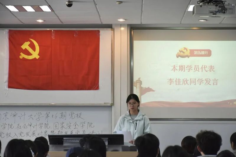 最后,本期党校学员代表李佳欣发言,表达了全体学员的决心与态度。她表示,同学们将始终秉持高度的政治自觉,以饱满的精神状态深入学习党的创新理论,特别是习近平新时代中国特色社会主义思想,深刻领悟“两个确立”的决定性意义,不断增强“四个意识”、坚定“四个自信”、做到“两个维护”,严守纪律、认真研学,确保学以致用、知行合一。