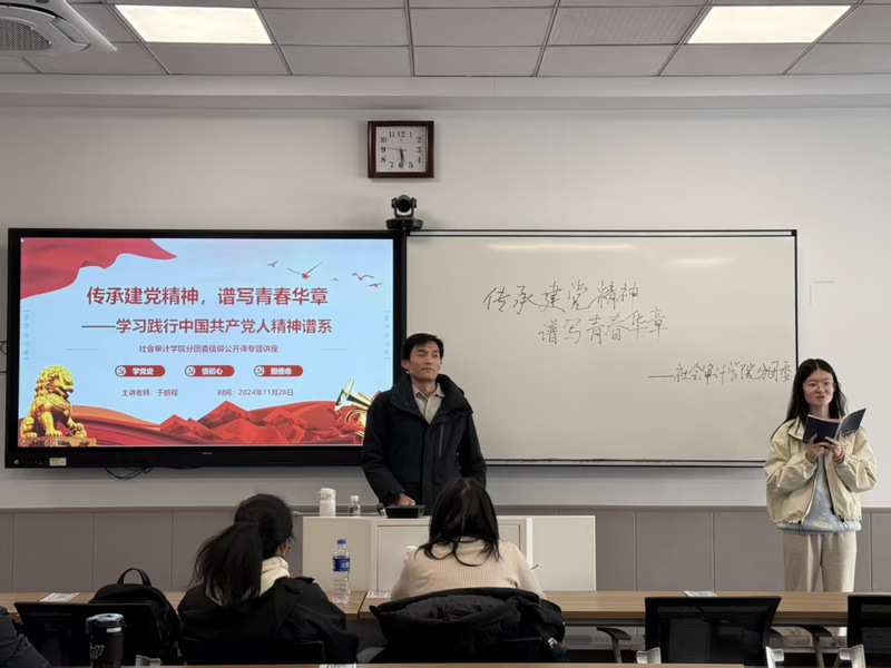 红色基因赓续传承,青春力量激昂奋进。近日,社会审计学院开展了主题为“传承建党精神,谱写青春华章”的信仰公开课。学院特邀于鹏程老师担任主讲人,带领同学们循着历史脉络学习以伟大建党精神为源头的中国共产党人精神谱系,让红色火种根植于心,为青年学子在新征程上勇毅前行注入信仰力量。