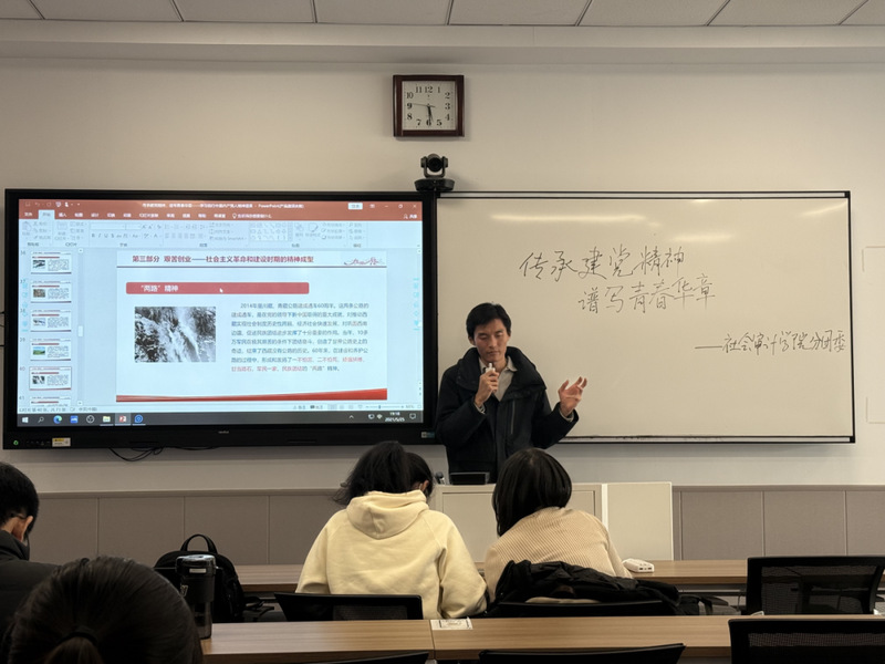 在厘清精神源头后,老师进一步按照历史发展脉络,分阶段梳理精神谱系的演进历程。从新民主主义革命时期,井冈山精神中“坚定信念、艰苦奋斗”的执着,长征精神里“不怕牺牲、排除万难”的坚毅,到社会主义革命和建设时期,“两弹一星”精神中“自力更生、艰苦奋斗”的坚守,大庆精神里“爱国、创业、求实、奉献”的担当,每一个精神的讲解都配以对应的历史影像资料。在此基础上,于老师继续讲解改革开放和社会主义现代化建设新时期的改革开放精神、特区精神等精神升华,以及中国特色社会主义新时代的脱贫攻坚精神、抗疫精神等精神闪耀。通过影像中黑白与彩色的交替、历史场景与现实画面的呼应,同学们在重温峥嵘岁月中,读懂了不同时代精神背后一脉相承的使命担当与价值追求。