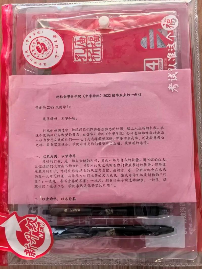 考研考公的道路或许充满艰辛与挑战,但有了学院的关爱与支持,同学们的逐梦之旅不再孤单。这份红色的助考礼包,不仅是一份物质上的馈赠,更是一份精神上的鼓舞,它承载着学院对同学们的深情厚谊和美好祝愿。 相信在母校南审和社会审计学院的温暖陪伴下,每一位备考的同学都能以更饱满的热情、更坚定的信念、更昂扬的斗志、更充分的准备,迎接即将到来的考试。愿大家都能执笔为剑,披荆斩棘,在考场上绽放出属于自己的光芒,顺利上岸、成就自己、实现梦想!