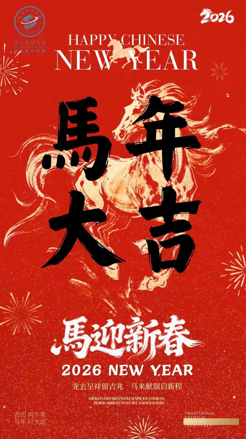 骏马奔腾迎新春,灵蛇舞韵辞旧岁。值此2026马年新春肇始、万象更新的美好时刻,社会审计学院向辛勤耕耘的全体教职工、向砥砺奋进的莘莘学子,向长期以来关心、支持学院发展的各级领导、兄弟学院及部门、社会各界朋友,尤其是海内外全体校友们,致以最诚挚的问候和最美好的祝福!