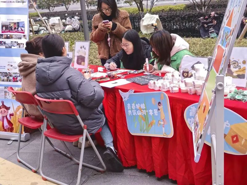 热闹的志愿嘉年华现场,是学院志愿者们服务群众的主阵地。在“青春护粮 共筑山河丰景”主题摊位前,志愿者们围坐在红色桌案旁,一边引导往来群众体验手绘、文创制作等互动项目,一边细致讲解粮食安全与节约理念。面对群众的咨询,他们始终面带微笑、耐心回应,用贴心指引和细致服务,让每一位到场者都能感受到志愿温暖,让市集氛围既热闹有序又充满温情。