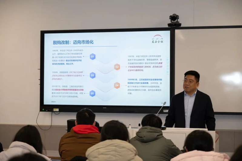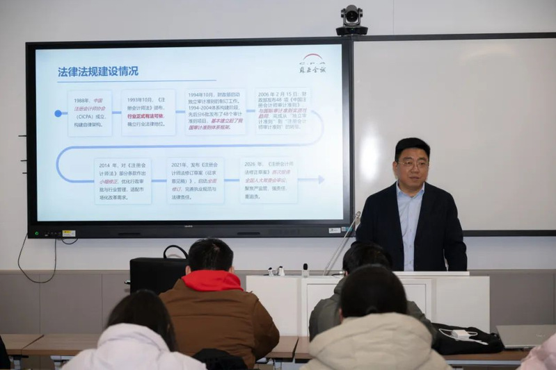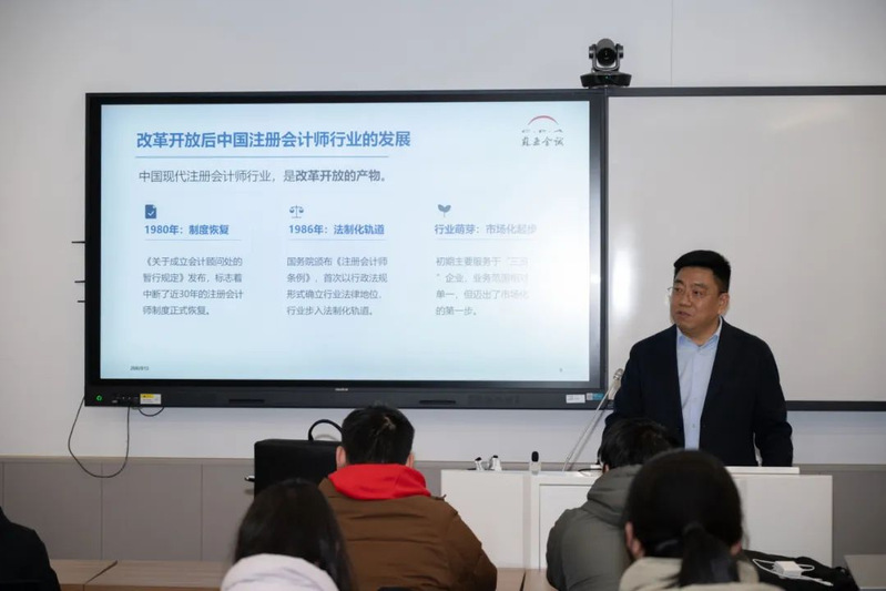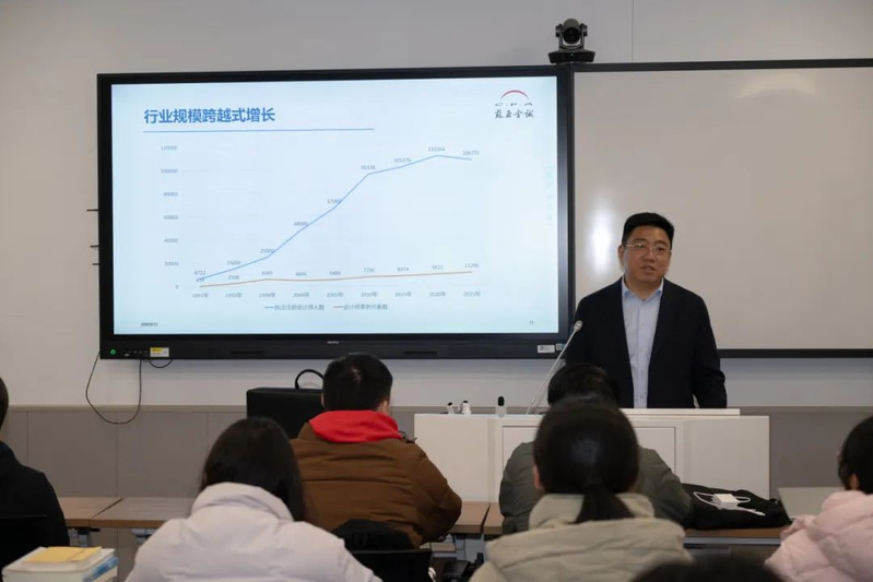 讲座伊始,院长王素梅致辞表示,学院始终将校企交流平台搭建作为人才培养的重要抓手,持续推动同学们接轨行业实务、拓宽专业眼界,本次专题讲座正是校企协同育人理念的生动实践。讲座中,于龙斌总经理以时间为脉络,系统梳理了注册会计师行业跨越百年的发展历程。从 18 世纪英国工业革命催生第三方审计诞生,到我国民国时期会计师制度的萌芽起步;从 1918 年我国第一家会计师事务所成立、首位注册会计师获颁证书,到新时代行业的高质量发展,他以一个个详实的历史节点,完整呈现了行业从无到有、从小到大、从弱到强的发展轨迹,并重点介绍了江苏省、南京市在全国注册会计师行业发展进程中的重要探索与突出贡献,让同学们对专业发展历史形成了全面且深刻的认知。
