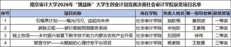 近日,社会审计学院的学子们在2026年“挑战杯”大学生创业计划竞赛校赛中凭借出色表现斩获一等奖1项、二等奖2项、三等奖1项 !本次竞赛全校各学院52支优秀团队同台竞技、尽展风采,各参赛队伍紧扣创业创新主题,充分展现了新时代南审学子扎实的专业素养、敏锐的创新思维与突出的实践能力。